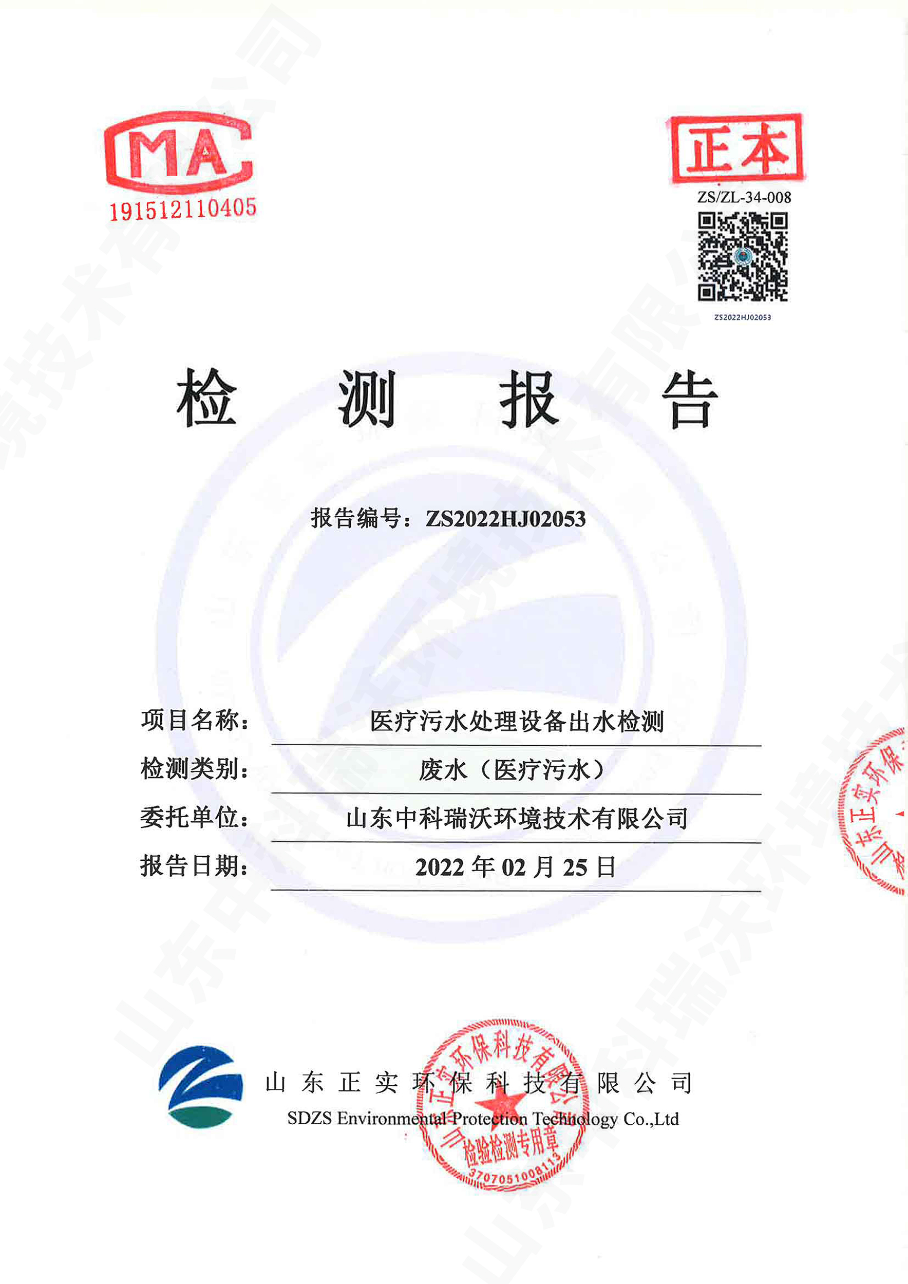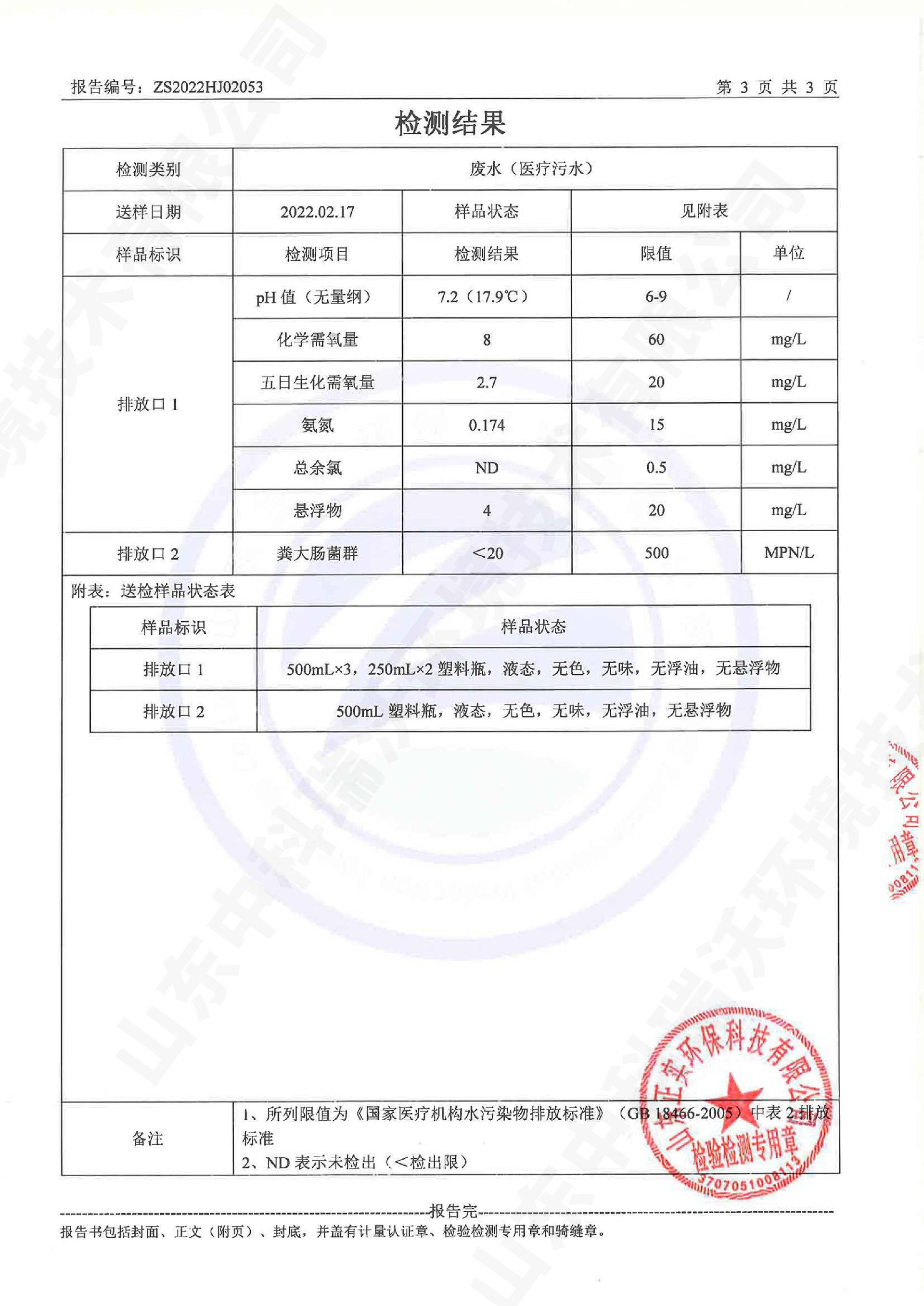 醫(yī)療污水處理設(shè)備出水檢測報告